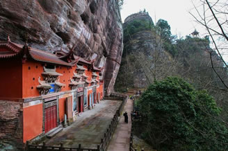 紫霄崖:于齊云巖西南。從浮云嶺西行,經(jīng)百丈泉、馴鹿洞、紫玉屏即達。古跡有:玉虛宮、治世仁威宮、天乙真慶宮、唐寅手撰碑銘、風虎關、云龍關遺址及摩崖石刻30余處。