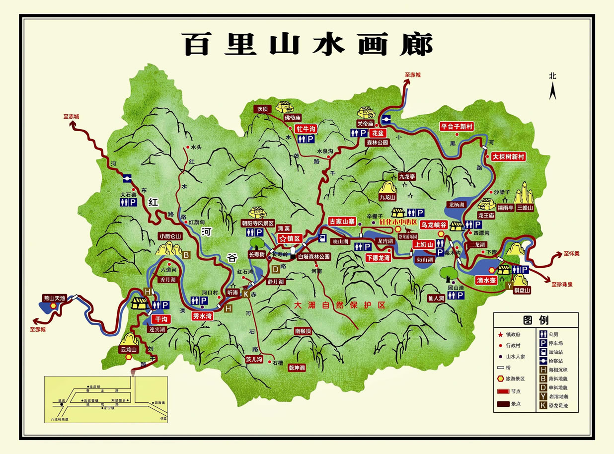 北京延慶百里山水畫廊景區(qū)位于延慶區(qū)東北部千家店鎮(zhèn)中國延慶世界地質(zhì)公園千家店園區(qū)內(nèi),屬延慶生態(tài)涵養(yǎng)區(qū)的核心區(qū),總面積371平方公里,距縣城40公里,距北京市區(qū)110公里。東與懷柔區(qū)毗鄰,北與河北省赤城縣接壤,西南、東南分別于香營、劉斌堡、珍珠泉三個(gè)鄉(xiāng)相連。灤赤、花千、花沙公路穿鎮(zhèn)而過自成環(huán)線,交通便利。