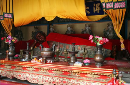 俗稱臥佛寺,位于海淀區(qū)香山壽安山南,始建于唐,清雍正十二年(1734年)大修后賜名“十方普覺寺”。全寺規(guī)模宏大,總體布局和建筑配置一定程度上保留了唐宋寺院的特點(diǎn)。臥佛殿內(nèi)的銅質(zhì)臥佛為元代遺存,長5.3米,高1.6米,重4噸,頭朝西面,面向南,鑄造精良,是中國現(xiàn)存最大的銅質(zhì)臥佛,具有較高價(jià)值,也是科技史研究的重要實(shí)物資料。