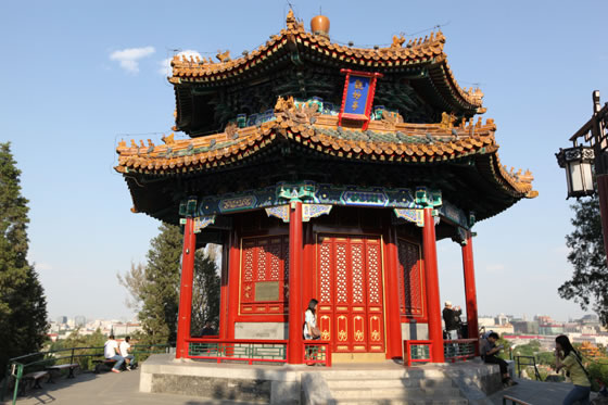萬(wàn)春亭:位于景山的中峰,中峰的相對(duì)高度為45.7米,是北京城南北中軸線上最高和最佳的觀景點(diǎn)。萬(wàn)春亭位于景山最高處,建于乾隆十五年(1750年),是北京南北建筑中軸線的基點(diǎn)。被譽(yù)為北京中軸線上的制高點(diǎn),京華覽勝第一處。亭高15.38米,平面呈四方形,為三重檐四角攢尖頂,上檐和中檐均為九踩三昂斗拱,下檐為七踩重昂斗拱,黃琉璃瓦覆頂綠剪邊,檐上有琉璃寶頂,建筑面積296.5平方米。萬(wàn)春亭的彩繪稱為:旋子大點(diǎn)金龍錦枋心,這也是中國(guó)皇家等級(jí)最高的彩繪形式。萬(wàn)春亭內(nèi)供奉著“毗盧遮那佛”,毗盧遮那佛也稱為大日如來(lái)佛,是釋迦牟尼佛的法身。毗盧遮那佛為密宗金剛界五方如來(lái)之首,在五方佛中代表法界體性智。亭中所供原佛像于二十世紀(jì)六十年代被損毀,重塑歸安后于2000年正式對(duì)外開(kāi)放。