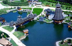 侗族建筑:侗族建筑景區(qū)占地4000平方米,建筑面積571平方米,建筑復原按貴州省從江、黎平地區(qū)的侗族典型建筑。規(guī)劃形式為寨,由鼓樓、風雨橋、寨門、戲臺、民居、水車、碾房、谷倉、稻田等組成。侗族建筑以杉木為原料,民居形式為干欄式。