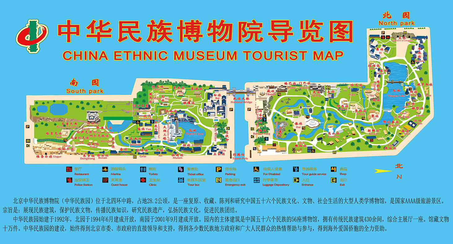 北京中華民族園,是集中國少數(shù)民族的傳統(tǒng)建筑、民族風情,歌舞表演,工藝制作以及民族美食為一體的大型民族文化園地。園內(nèi)建有國內(nèi)最大伯鑄鐵雕塑以及仿真的熱帶榕樹林、水中溶洞,土林、盤龍瀑布,滄源巖畫、阿里山神木等。南園也已建成完畢,主要有民族博物館和雕塑廣場等大型設施,以及二十余個民族村寨。