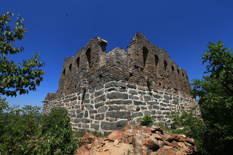 九眼樓長城 九眼樓長城位于四海鎮(zhèn)火焰山頂部。因敵樓每面有9個箭窗,故名。又因山勢高峻,晴天可望到北京城,故也稱望京樓。為長城重要關口之一。海拔1141米,F樓內有灶炕、居室遺跡,近處有馬場、晾馬場、軍營(營城)遺跡。樓北側有明代官員徐申于萬歷十三年(公元1585年)巡行到該地書寫的大理石碑一方。 九眼樓為正方雙層建筑,因每邊有九個了望孔而得名,現存一層,高度為7.8米,每邊為13米,了望孔高1.65米,寬0.5米,內有軍士來往巡視寬1.2米的環(huán)行步道。九眼樓下部砌石條,上部用白灰砌青色城磚,構建十分堅固而壯美。樓下西側有小平臺,為軍士集中的場地。平臺北側,有磚砌的臺階,沿臺階可達樓南門。樓頂為磚砌券拱式結構,樓內寬大,可住兵儲器,向北開兩窗,四面各有一門,門高兩米,闊1.2米,出入極便利。 |