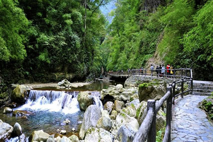 魚跳峽是黑山谷第三個峽谷,峽谷全長520米,該段峽谷曲折迂回,古木參天,蒼翠欲滴,飛瀑流泉隨處可見。每年春夏季節(jié),下游的紅尾鯉、青色鯽魚、紅尾高山鯰等魚類如果要進(jìn)入上游,必須由此彈跳越過落差達(dá)1米高的魚跳灘,峽谷因此而得名。