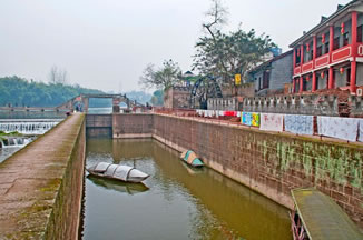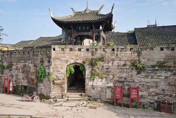 日月門:系大榮寨的四大城門之北門,門樓上有日月亭,門內(nèi)即煙雨巷,“橋橫古渡煙霞聚,寨聳雄關(guān)日月巡”。門內(nèi)有一甕形古井,深12.2米,內(nèi)設(shè)暗道通往河心,由重一噸多的石板遮蓋。該井系嘉慶年間修建的戰(zhàn)備設(shè)施,以備遭兵匪長(zhǎng)期圍困時(shí)取水傳信之用。