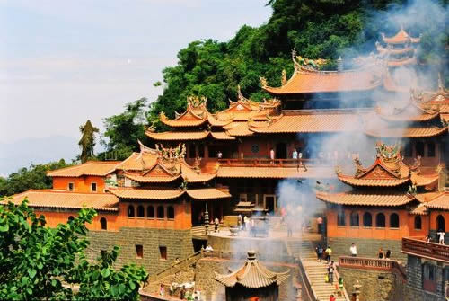 蓬萊祖殿為清水巖的主體建筑,創(chuàng)建于宋代。它依山臨壑,外觀呈“帝”字形,七妙地將人工建筑與自然巖壑融為體,古典雅,輪奐輪閏正殿為重檐山頂?shù)臉情w式建筑,由昊夭口、祖師殿、釋迦樓三部分組成,大殿兩側(cè)有檀樾廳、觀音廳、芳名廳、齋房、客舍等等,鱗次櫛比,相傳共有九十九間。蓬萊祖殿無論在建筑布局還是建筑風(fēng)格以及雕技術(shù)、裝外飾工藝方面都頗具特色,是福建省重點文物保護單位。 |