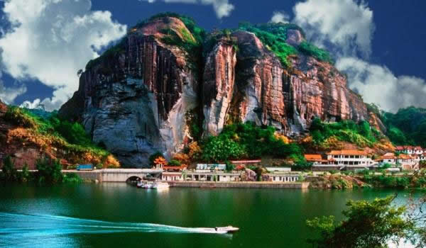 桃源洞因盛產(chǎn)栟櫚樹,古有栟櫚山之稱。風(fēng)景區(qū)起始于唐代,五代后晉年間建有寺廟,到了明代風(fēng)景區(qū)得到較大的發(fā)展。南宋宰相李綱和左正言鄧肅及明代大旅行家徐霞客都曾在此駐足并留有詩句。明代萬歷年間(公元1605年)當?shù)匕采叭藘煽に抉R陳源湛捐資建有亭、臺、樓、閣十余處,取“世外桃源”之意改名為桃源洞,并在入口處120米高的赤壁上刻有“桃源洞口”四個大字,從此桃源洞名聞遐邇。這里丹霞地貌形成了眾多的奇峰峭壁,綠海林濤和碧水丹山。
