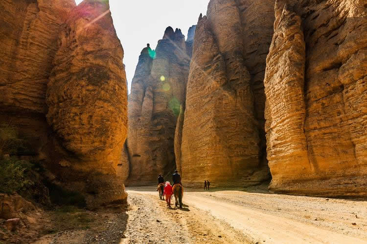 這里的石柱石筍大多高達(dá)八十至一百米之間,最高達(dá)二百多米,均由橘黃色砂礫巖構(gòu)成,鬼斧神工,猶如雕塑大師之夢幻杰作。我們左行至飲馬溝入口,換乘當(dāng)?shù)剞r(nóng)民裝扮得極富民俗風(fēng)情的驢車前行。進(jìn)入峽谷,兩邊布滿了巨大的石筍、石人、石鐘、石崖、石窟,峰回路轉(zhuǎn),步移景變,人們將石景命名為:大象吸水、千帆競發(fā)、伴侶駝、“黃河母親”等等,其形神兼?zhèn)洌蜩蛉缟?/p>