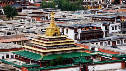 寺院坐北向南,占地總面積86.6萬平方米,建筑面積40余萬平方米,主要殿宇90多座,包括六大學(xué)院、16處佛殿、18處昂欠(大活佛宮。、僧舍及講經(jīng)壇、法苑、印經(jīng)院、佛塔等,形成了一組具有藏族特色的宏偉建筑群,房屋不下萬間。