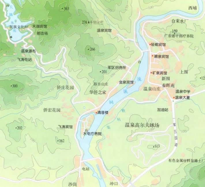 泉區(qū)共有泉眼13處,分布在河?xùn)|、河西兩岸。泉水含有多種化學(xué)成份,溫度最高可達(dá)73℃,最低的也有30℃。在此洗浴,可以有效地消除身體的疲乏,調(diào)節(jié)各器官的功能,多次沐浴能達(dá)到祛病強(qiáng)身的目的。壯麗的碧浪橋橫跨流溪河,將兩岸連為一體。河?xùn)|岸是溫泉療養(yǎng)區(qū),河西岸是旅游賓館別墅區(qū)。