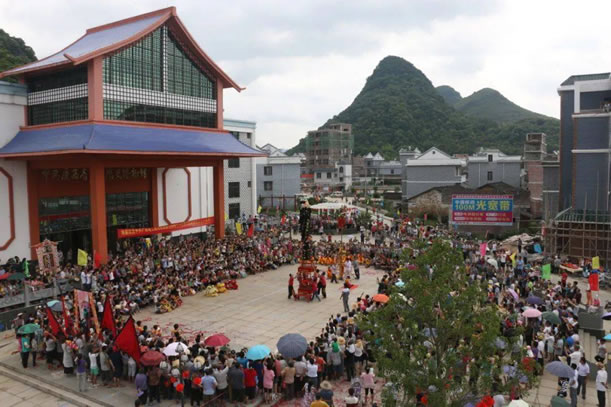 位于鐘山縣城西面公安鎮(zhèn)大田村,距縣城約十公里,此戲臺建于清光緒四年(即1878年),為磚、石、木結構,呈凸字形,通高10余米,由前臺和后臺 組成,前臺面寬6.37米,深5.5米;后臺寬10.12米,深3.6米;基高1.8米。整座戲臺青石青磚,雕工極為精美圓潤,八柱梁構架,八角藻井復 頂,鼓石墊柱,青磚砌墻,青石為基,基旁雕以八仙賀壽,鑿雙龍以戲珠,臺上鏤兩虎以扶角,嵌二獅以呈瑞,后屏風飾以山川樓閣,彩鳳仙鶴等木雕,工藝精湛, 構圖和諧。戲臺除古樸典雅、雄偉壯觀,且符合力學、聲學原理,整座戲臺屬水口廟附屬建筑,隱映于古樹秀竹之中,清澈的溪流環(huán)繞其中,整個環(huán)境優(yōu)雅別致,清 靜恬適,為廣西不可多見的古戲臺之古代建筑之一。1981年列為廣西壯族自治區(qū)重點文物保護單位。該戲臺所處村莊大田村也是一個很有特點的村莊,老屋、古 榕、古樟在池塘的映襯下顯得特有韻味。