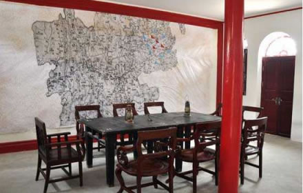 軍委總司令辦公室(作戰(zhàn)室)在遵義會議會議室正對的樓下,面積為56平方米,兩間長方形的房間組成,中間布一道可折疊的六合門。屋子正中陳列著兩張黑漆大方桌,桌上有鐵座馬煙、訂書機、中華蘇維埃共和國革命軍事委員會信 、報紙做的信封、30年代商務印書館出版的中國分省地圖冊以及《陳中日記》等。屋子的西窗下陳列著兩張三屈桌,桌上置西部皮包電話機,桌下立著線拐子。東窗下陳列著一對灰褐色的鐵皮公文挑箱。北壁上陳列著一幅巨大的云、貴、川三省接壤地區(qū)的軍用地圖,當年軍委副主席周恩來、紅軍總司令朱德、總參謀長劉伯承等經(jīng)常在這里辦公。