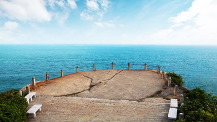 觀日巖位于蜈支洲島的東南懸崖處。站在巖上憑海臨風(fēng),俯瞰全島,遼闊的南海盡收眼底。懸崖下面,怪石嶙峋。 風(fēng)平浪靜之時(shí),乘快艇環(huán)島游,石景千奇百怪,觀日巖像一尊天然大石佛,面向大海,日夜修煉。新世紀(jì)的曙光從這里升起,緋紅的太陽從海面上徐徐上升,形成海天一色的海上觀日點(diǎn)。住島客人若欲觀看日出,可向酒店前臺咨詢?nèi)粘鰰r(shí)間。