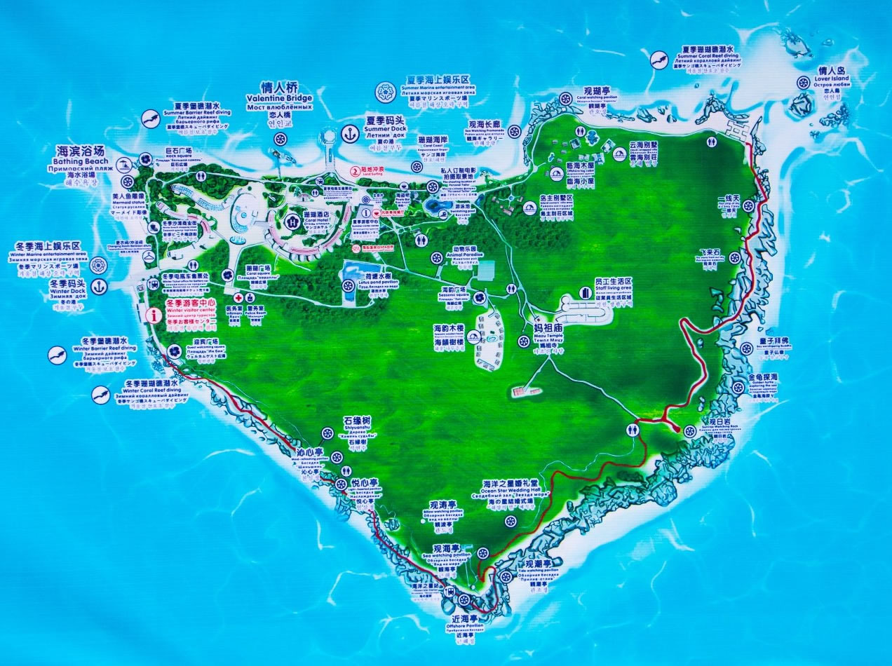 距三亞市30公里,鳳凰機(jī)場38公里,緊靠?谥寥齺喌母咚俟,位置優(yōu)越,交通便利。蜈支洲島是海南島周圍為數(shù)不多的有淡水資源和豐富植被的小島,有二千多種植物,種類繁多。