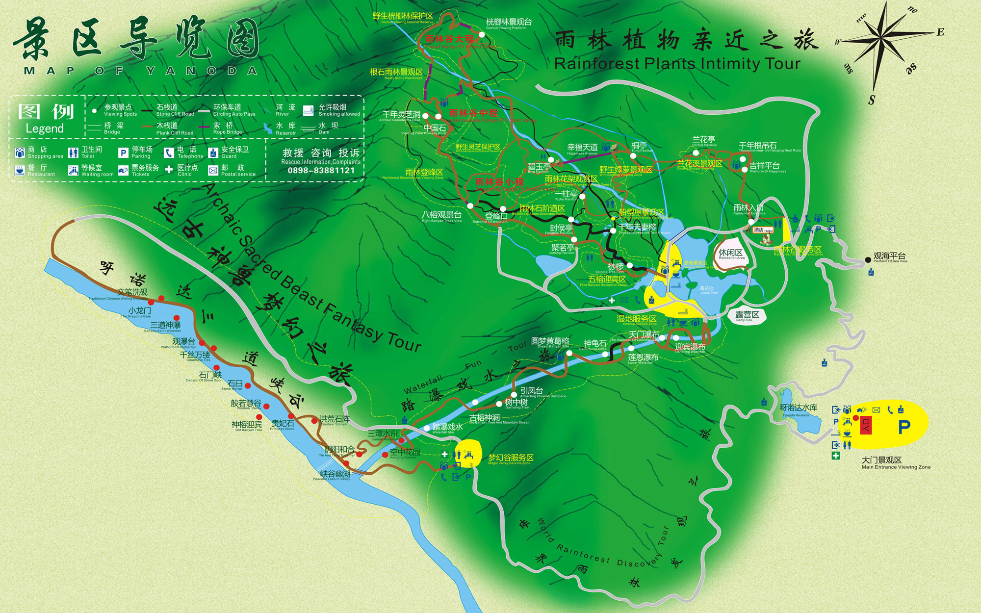 雨林谷以展現(xiàn)原生態(tài)的熱帶雨林景觀為核心,匯集參天巨榕、百年古藤、黑桫欏、仙草靈芝、見血封喉、野生桄榔以及“高板根”“根抱石”“空中花園”“老莖結(jié)果”“植物絞殺”“藤本攀附”熱帶雨林的六大奇觀等。雨林谷是“天然氧吧”和負(fù)氧離子發(fā)生器,此地年平均溫度24度。雨林谷游覽通道由木棧道、野趣石階、吊橋組成,長達(dá)3.5千米,分為大、中、小三個(gè)環(huán)行線路。