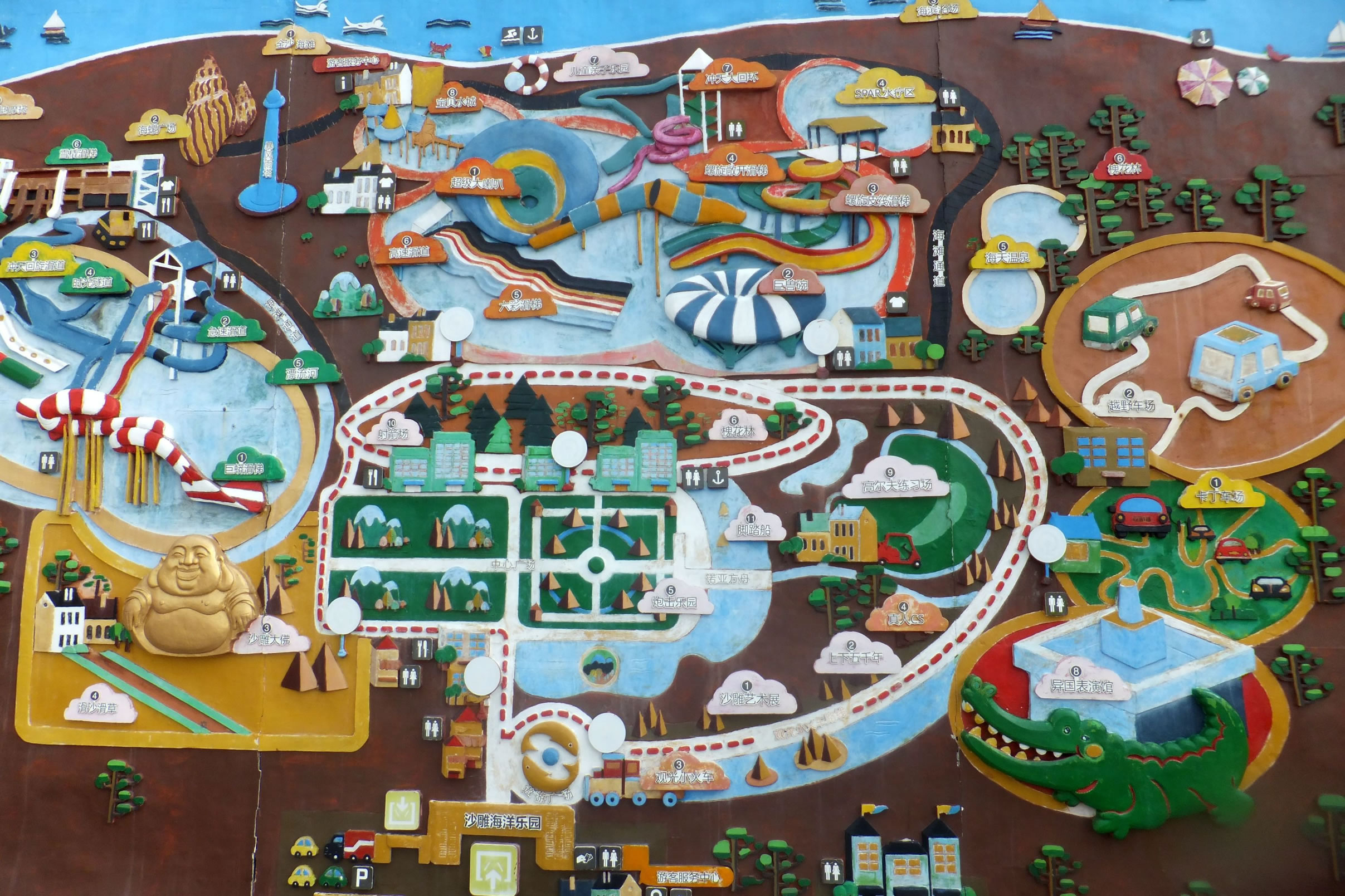 水樂園1期:超級大喇叭、高速滑道、六彩滑梯、寶貝水城、螺旋敞開滑梯、巨獸碗、沖天大回環(huán)。