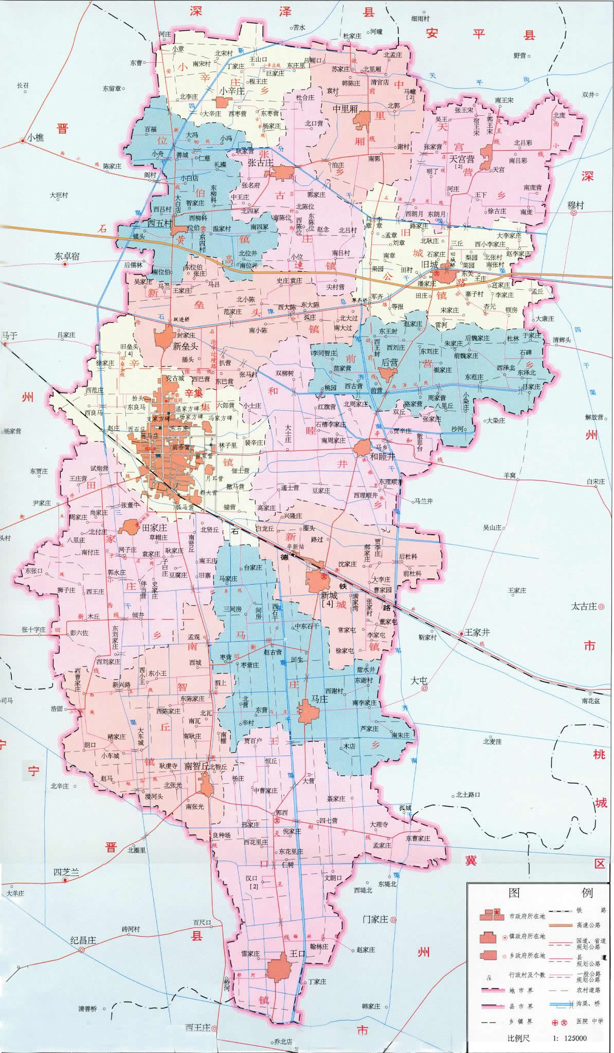 鎮(zhèn):辛集鎮(zhèn)、舊城鎮(zhèn)、張古莊鎮(zhèn)、位伯鎮(zhèn)、新壘頭鎮(zhèn)、新城鎮(zhèn)、南智丘鎮(zhèn)、王口鎮(zhèn)