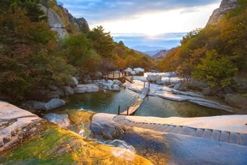 夏季,風(fēng)涼氣爽,云蒸霞蔚。登臨主峰,可觀云海,看日出,瞧佛光,俯群山。云海、云流、云瀑是祖山夏季的特有景觀。因祖山海拔較高,又瀕臨渤海,此時登臨任何峰頂,可觀到滔滔的云海,觸摸到擦肩而過的朵朵白云,她們一會兒行云流水,環(huán)山而淌;一會兒宛如融雪的春潮,裊裊地升入蔚藍(lán)的天空;一會兒像脫結(jié)的野馬,入海的姣龍,奔騰咆哮,排山倒海。當(dāng)你倘佯在“北龍?zhí)丁、“花果山”景區(qū)時俯看谷中,涓涓細(xì)流,清澈見底;仰望山間,瀑布飛掛,奔騰咆哮,大有“飛流直下三千尺,疑是銀河落九天”之氣魄沿溝谷而下,那真是水繞青山,山繞水,山浮綠水,水浮山。