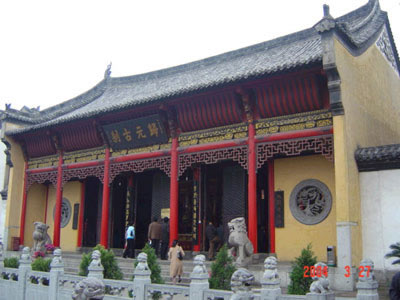 中院的主體建筑是大雄寶殿。該殿初建于清順治十八年(1661年),后經(jīng)多次維修。現(xiàn)大雄寶殿是清光緒三十四年(1908年)重修,經(jīng)過近年來的維修,氣勢宏偉。大殿正中供奉著釋迦牟尼坐像,兩側(cè)為其弟子阿難和迦葉,均為托沙雕塑。釋迦“偏袒右肩,結(jié)跏趺坐”,十分莊嚴靜穆,威儀儼然。佛像后的背光是用樟木雕刻而成的“五龍捧圣”的圖案。佛像前還有韋馱、彌勒、地藏像,佛像后是一組海島觀音像,只見海島觀音赤足站在鰲頭上,左右侍立著龍女和童子,背后是一面高達八尺的泥塑懸崖峭壁,足下碧波萬頃,怒濤洶涌。整個塑像向前傾覆。人們仰視上去,只見觀音衣袖似在飄動,正在洶涌的波濤上迎面向你浮來,增加了宗教藝術(shù)的感染力。