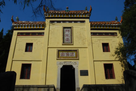 又名武侯宮,坐赤壁山東南處的南屏山頂,是為了紀(jì)念在三國(guó)演義描述的赤壁之戰(zhàn)中,諸葛武侯在此“設(shè)壇臺(tái)、借東風(fēng)、相助周郎”而建造的。整個(gè)建筑面積有310平方米,分前后兩殿廟堂,內(nèi)殿供有劉備、關(guān)羽、張飛、諸葛亮的全身塑像,袍帶飄逸,栩栩如生。左側(cè)有文物陳列館,建于1979年,館內(nèi)陳列赤壁出土文物1000余件,有刀、槍、劍、戟、鏃、戈、帶鉤及東吳銅幣(“大錢當(dāng)千”、“大泉五百”、“大泉當(dāng)百”),并有東漢銅鏡和“剪輪五銖”錢及大量東漢、三國(guó)時(shí)的陶器等。右側(cè)“東風(fēng)閣”于1975年建造,供游人歇憩。今拜風(fēng)臺(tái)系1935年重建,1948年維修。