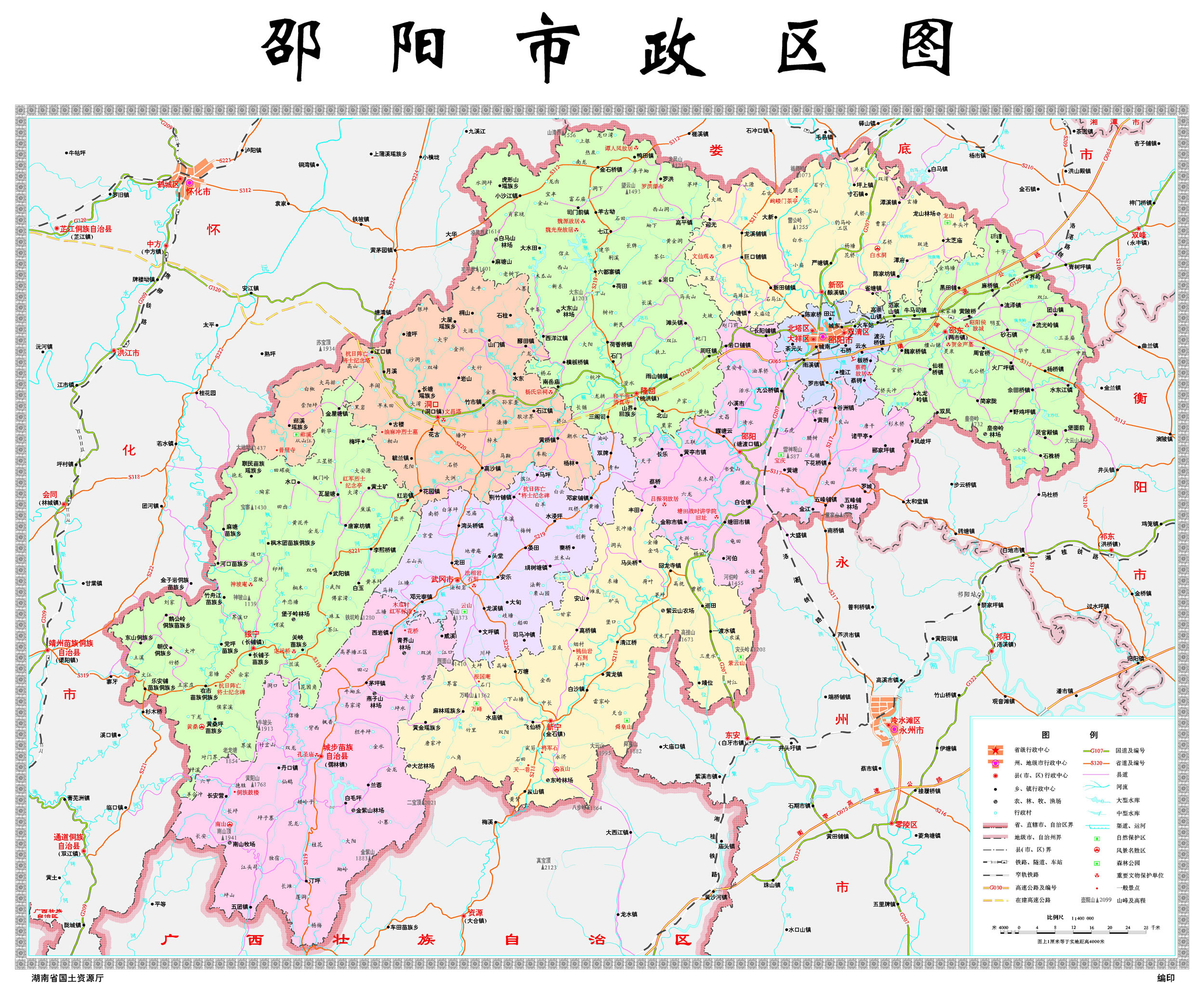 邵陽市歷史悠久,名傳瀟湘。境內(nèi)早在商代即有先民繁衍生息,西漢初置縣,歷經(jīng)昭陵、邵陵、邵陽、敏州、邵州、寶慶,最后定名為邵陽。清代,寶慶府城資江繞郭,邵水穿城,環(huán)城墻炮臺(tái)林立,加之山環(huán)水復(fù),攻之不易,留下“鐵打的寶慶”美名。邵陽有大小旅游資源三百余處,有世界自然遺產(chǎn)和AAAAA級(jí)景區(qū)新寧崀山、南山國(guó)家公園、綏寧黃桑、武岡云山、隆回虎形山、隆回魏源故居、洞口蔡鍔公館、邵東昭陽侯國(guó)城址、武岡法相巖等人文美景;曾入選第一批全國(guó)法治政府建設(shè)示范地區(qū)和項(xiàng)目名單、全國(guó)雙擁模范城(縣)名單、湖南省真抓實(shí)干成效明顯的地區(qū)名單。