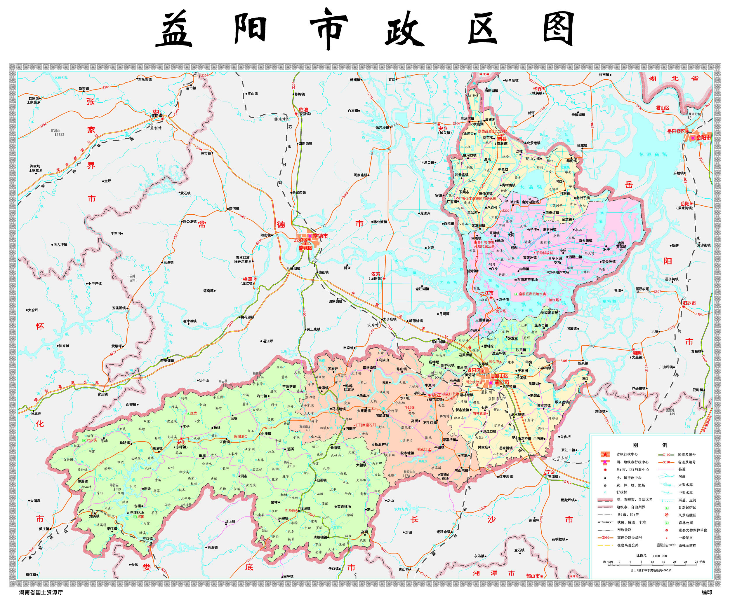益陽市位于湘中和湘北,跨越資水中下游,處沅水、澧水的尾閭,環(huán)洞庭湖西南,居雪峰山北段的主干及其余脈,是湘中丘陵向洞庭湖平原過渡的傾斜地帶。益陽市地形西高東低,成狹長狀。東西最長距離217千米,南北最寬距離173千米,總面積12320平方千米,從地圖上看,像一頭翹首東望、伏地待躍的雄獅。四鄰東與岳陽縣、湘陰縣為界,東南與寧鄉(xiāng)市、望城區(qū)接壤,南與漣源市、新化縣相連,西與溆浦縣、沅陵縣交界,西北與桃源縣、鼎城區(qū)、漢壽縣、安鄉(xiāng)縣毗鄰,北與華容縣相連。