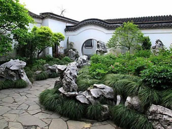 黃石疊砌的云崗,環(huán)山有石徑,后山有蹬道可供登高,山上有青楓、玉蘭。