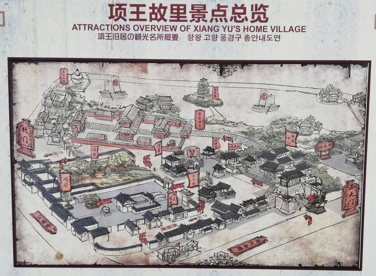 2012年9月29日盛大開園的核心景區(qū)共10萬平方米,主要有古城門、項羽雕像和以項羽為主題的4D電影院,以及項府、項園、將署、項羽故居、項家宗祠、霸王古今館、虞家老宅十個主要景點。