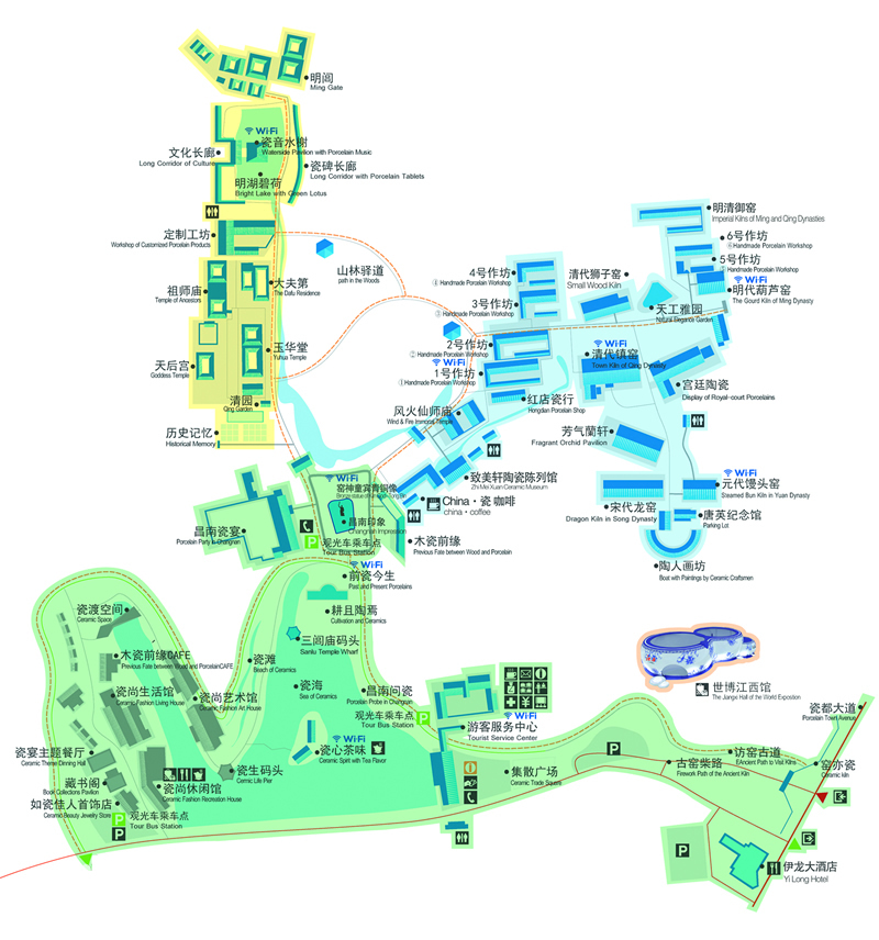 景區(qū)分為歷代古窯展示區(qū)、陶瓷民俗展示區(qū)、水岸前街創(chuàng)意休憩區(qū)三大區(qū)域。