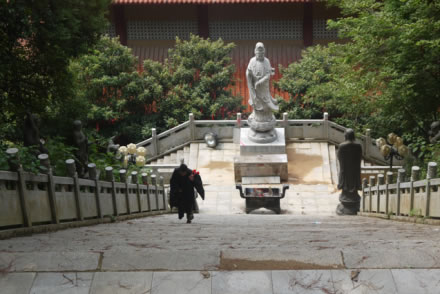天寧古寺有過極盛的年華,隨著滄桑的變遷,屢經(jīng)摧殘,古寺蕩然無(wú)存。至1985年9月僅存一座高不到 二米、面積不足18平方米,風(fēng)雨飄搖的觀音間,神龕上只有一張圖像供游客參拜,當(dāng)年61歲的萬(wàn)仁英同志,誠(chéng)虔地來(lái)此剃發(fā)為尼,授法號(hào)叫釋順因,并將她多年的積蓄六千元贊助寺內(nèi)作經(jīng)費(fèi)。在古寺住持垂范下,用了七年時(shí)間,建成了一座氣派軒昂,規(guī)模宏偉的綜合性寺廟。建筑面積達(dá)五千平方米,屹立在灣里區(qū)南端,接待八方香客和游人。