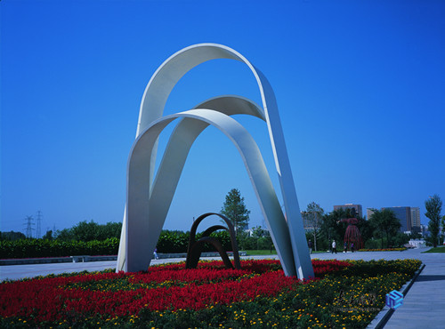 從長春世界雕塑公園的東門開始,拾級(jí)而上,就能夠到達(dá)“和平廣場”。廣場正中矗立著美國雕塑家馬克?威斯白克創(chuàng)作的“和平的延伸”。該作品由大小兩組曲面構(gòu)成兩扇門的形式,跨立在大理石路面當(dāng)中,形成由遠(yuǎn)及近的視覺沖擊感,象征著和平之路的延伸,表達(dá)了人類對(duì)和平與美好的共同期盼。雕塑主體周圍有數(shù)個(gè)花壇,經(jīng)常種植紫色,黃色等多彩的草本花朵,很多攝影愛好者都選擇面向東門的方向拍攝,藍(lán)天白云與延伸感的視點(diǎn),讓人感到平靜祥和。