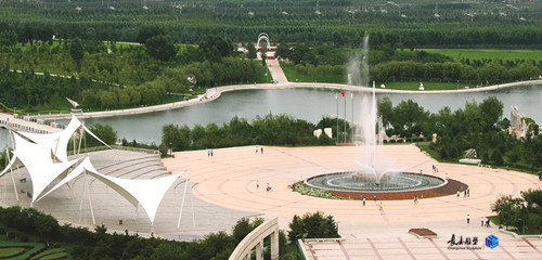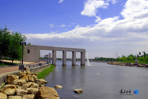 規(guī)劃采用中國傳統(tǒng)與西方造園學(xué)說和現(xiàn)代規(guī)劃理念相結(jié)合的構(gòu)思,達(dá)到了自然與人文的和諧統(tǒng)一,主入口大門及兩側(cè)弧形引導(dǎo)墻,沿中軸線對(duì)稱布局相得益彰;不對(duì)稱的景觀廣場,運(yùn)用巧妙的軸線轉(zhuǎn)折,通過拱形橋與主題雕塑遙相呼應(yīng)。