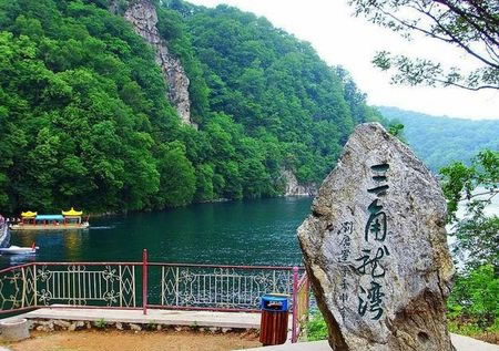 三角龍灣又名黑龍?zhí)叮瑐髡f(shuō)有一條三只角的黑龍距此修煉,經(jīng)常行云布雨,除惡降魔,普濟(jì)四方百姓,后來(lái)黑龍飛往長(zhǎng)白山天池,龍去留淵,留有一灣圣水。位于輝南城朝陽(yáng)鎮(zhèn)東南45公里處的高山密林之中。系古代火山噴發(fā)口積水而成,因水面呈三角形,加之湖南側(cè)矗立著30米高的三角石,故名“三角龍灣”。是進(jìn)入長(zhǎng)白山的門(mén)戶(hù)之一。這里自古以來(lái)風(fēng)光秀美,景色迷人。我國(guó)著名第二大火山群—龍崗火山群就分布在這里。