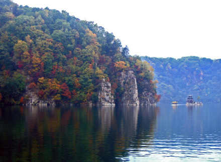 映霞壁是碼頭邊的陡峭石壁,高90余米,面向正東,每天朝陽(yáng)初升的時(shí)候,萬(wàn)丈霞光與水氣發(fā)生了光學(xué)折射,遠(yuǎn)遠(yuǎn)望過(guò)來(lái),佛光普照,宛如迷離仙境一般。