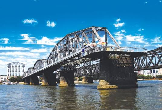 鴨綠江斷橋為鴨綠江上諸多橋中第一座橋,由日本朝鮮總督府鐵道局所建。1909年5月動工,1911年10月竣工。1950年11月,被美國空軍炸斷。戰(zhàn)后中方一側(cè)所剩四孔殘橋一直保留,被習慣上稱為“斷橋”,朝方一側(cè)則把所屬六孔和中方剩余兩孔殘橋拆除,僅存橋墩。
