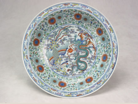 清雍正款斗彩龍鳳大盤:此盤為白地斗彩大盤,盤內(nèi)飾斗彩龍鳳戲珠紋,一條行云五爪飛龍,龍身蜿蜒矯健,鳳舞展翅穿于祥云之間,呈龍飛鳳舞圖案。盤外飾海水江崖,壽山福海。壽山上靈芝盛開,云蝠翩翩。底“大清雍正年制”六字兩行雙圈青花楷書書款。整個(gè)大盤胎質(zhì)細(xì)膩,釉色純正,造型規(guī)矩,為清宮祝壽時(shí)的御用器皿。