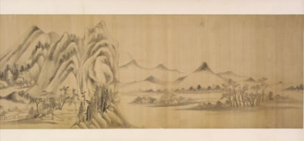 董其昌仿米黃山水圖卷:明晚期,絹本。用筆參以披麻與米點(diǎn)皴法,為其自家面貌。卷后部行書自題:“家有黃子久《富春大嶺圖》、米元暉《瀟湘圖》,和會兩家筆意為此卷,大都子久畫出于巨然與海岳父子同參也!焙笫鹂睿骸岸鬃R”,下鈐“知制誥日講官”、“董其昌印”白文印二方?顐(cè)鈐“楨父審定”、“墨緣堂來氏收藏書畫記”二印。
