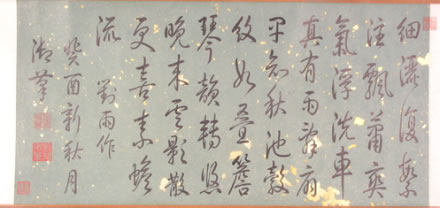 清弘歷行書對雨詩卷:此書卷作于乾隆十八年(1753)。綠色片金蠟箋紙。引首騎縫鈐篆書朱文“石渠寶笈所藏”方印,行書寫自作五言律詩一首,全詩為“細(xì)灑復(fù)絮注,飄蒲爽氣浮。洗車真有雨,壽扇果知秋。池轂紋如疊,檐琴韻轉(zhuǎn)悠。晚來云影散,更喜素蟾流!痹姾笞灶}“對雨作”,后署款“癸酉新秋月,御筆”。