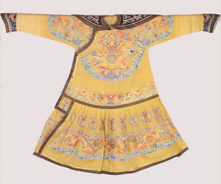 清明黃納紗五彩金龍夏朝服:清代光緒皇帝載湉御用。此朝服是夏季禮服之一,為其登基、大婚、萬壽圣節(jié)、祭天等重大典禮和祭祀活動時(shí)所穿禮服。為明黃顏色,是一種披肩領(lǐng)、馬蹄袖的大襟袍。披肩為黑紗地納紗繡平金龍二條,上衣兩肩和前胸、后背飾正龍各一條,飾有傳統(tǒng)紋樣十二章,間以五色云紋,下幅為平水紋飾。