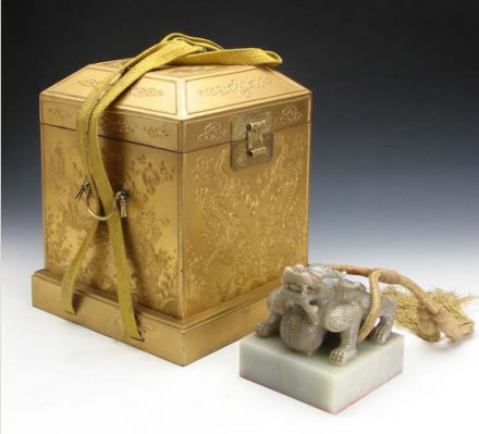 清世宗憲皇帝謚寶:此寶為嘉慶四年(1799)清宮內(nèi)府遵旨由舊寶改鐫而成。寶上部為單體蹲龍紐,描金,紐上系明黃絲繩。謚寶文字為滿、漢文合璧,均為朱文,右側(cè)為漢文篆書四行,左側(cè)為滿文篆書四行。其文為“世宗敬天昌運(yùn)建中表正文武英明寬仁信毅睿圣大孝至誠憲皇帝之寶”。謚寶外包明黃織金四則團(tuán)花暗云紋錦包袱皮,用雙層龍鳳紋金漆套盒盛裝。該寶于嘉慶四年改鐫后由北京送至盛京太廟尊藏,清末民國時(shí)期存于沈陽故宮崇謨閣內(nèi)。