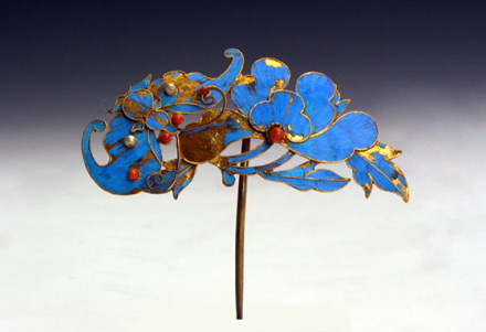 清點(diǎn)翠頭簪:用珊瑚、珍珠制成。整個(gè)主題為蝶戀花,蝴蝶在花下,一花開放,旁有兩朵含苞欲放的花,蝴蝶和花均為藍(lán)色,應(yīng)為翠鳥毛制成,花瓣為兩層,均為五瓣,花蕊用珊瑚制成,兩花苞微微下耷,蝴蝶的翅膀?yàn)檎归_狀,蝴蝶的眼睛及翅膀上均有珊瑚珠。