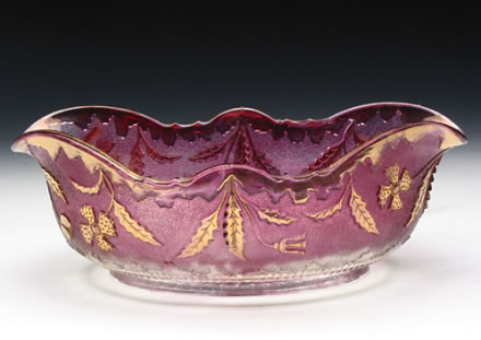 清紫色玻璃描金花卉紋盆:此盆屬于磨花玻璃。此盆通體為紫色玻璃,花口,呈四大瓣夾兩小瓣式,口邊描金,腹部飾突起之花卉,亦描金;底飾菊瓣紋,盆底橢圓形,邊緣為鋸齒狀,不是特別規(guī)整。此盆以紫色玻璃配描金花卉的裝飾,高雅別致。