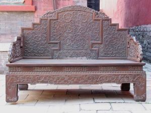 崇政殿室內(nèi)的寶座、屏風(fēng)等陳設(shè),并非清太宗時(shí)期的原貌,而是乾隆十二年(1747年)根據(jù)皇帝的旨意重新設(shè)計(jì)制做的,堂陛之內(nèi)的屏風(fēng)寶座,是乾隆特命仿北京故宮乾清宮所用加以縮小精心制作的,寶座、屏風(fēng)各以九條龍做為主要裝飾,全部罩以金漆,體現(xiàn)其唯一的使用者──皇帝的無上尊嚴(yán)。屏風(fēng)上的四言十二句銘文,與乾清宮屏風(fēng)上的完全相同 ,是康熙皇帝從古代經(jīng)書中摘出,做為自己和后世皇帝治理國家的座右銘鐫刻在御座之旁的。陳設(shè)在龍椅前后的鶴式燭臺、熏爐、塔式香亭、 端、“太平有象”等,都是乾隆年間宮中精制的琺瑯禮器,專用于皇帝御座周圍,既為熏香之用,也有驅(qū)邪諏吉的寓意,使得“真龍?zhí)熳印迸R朝理政之處更具有莊嚴(yán)神圣的氣氛。乾隆、嘉慶、道光幾位皇帝東巡盛京期間,都曾坐在這里接受群臣的朝賀叩拜,慶祝自己祭陵大典的成功。