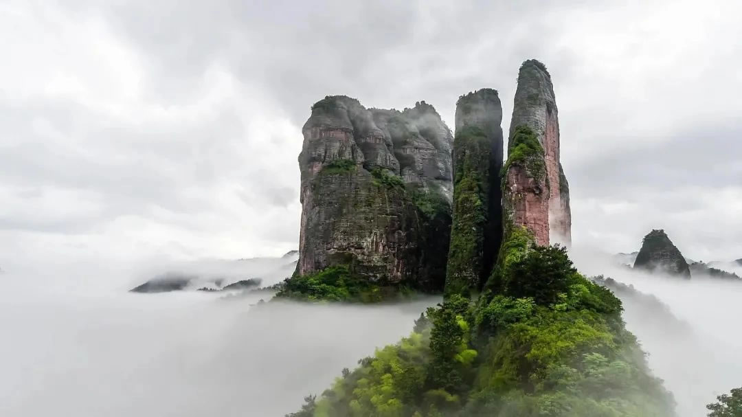 - 特色:江郎山的標(biāo)志性景觀,由三塊巨石組成,形似石筍天柱,被譽(yù)為“神州丹霞第一峰”。