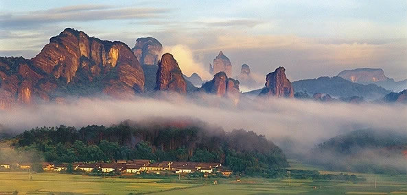丹霞山風(fēng)景名勝區(qū),位于廣東省韶關(guān)市東北側(cè)的仁化縣,是南嶺南麓的一個(gè)山間盆地,總面積292平方公里。丹霞山由紅色砂爍巖構(gòu)成,以赤壁丹崖為特色,因"色如渥丹,燦若明霞"得名。地質(zhì)學(xué)家以丹霞山為名,將這一地貌命名為“丹霞地貌”。丹霞山是丹霞地貌命名地,是全球發(fā)育最典型、類型最齊全、造型最豐富、景觀最優(yōu)美的丹霞地貌集中分布區(qū),在“中國最美的丹霞地貌”評(píng)比中被中國國家地理、中央電視臺(tái)等聯(lián)合評(píng)選為第一名。