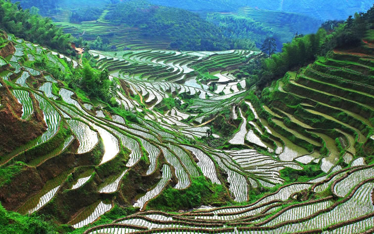 - 亮點(diǎn):梯田如巨龍盤(pán)旋而下,春季灌水時(shí)形成“鏡面梯田”,倒映云影天光。