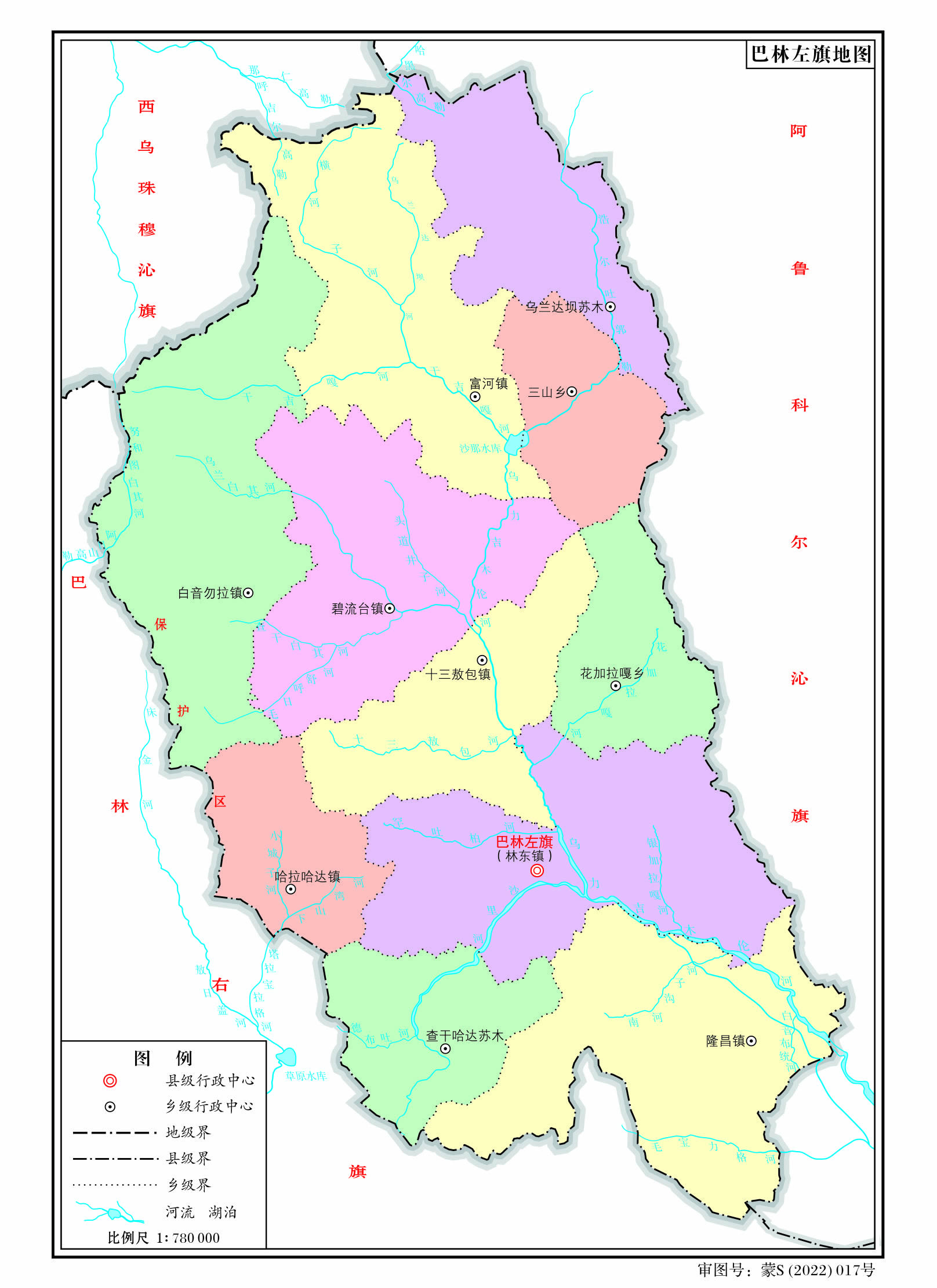 鎮(zhèn):林東鎮(zhèn)、碧流臺鎮(zhèn)、隆昌鎮(zhèn)、十三敖包鎮(zhèn)、白音諾爾鎮(zhèn)、富河鎮(zhèn)、哈拉哈達鎮(zhèn)