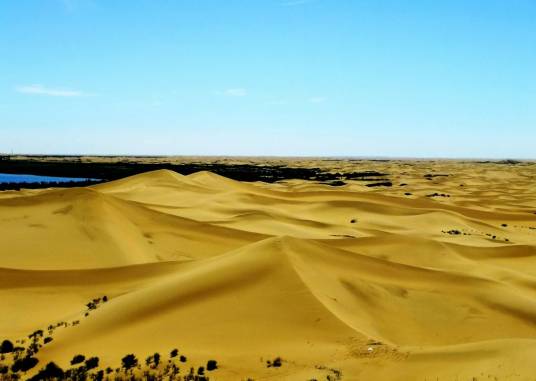 庫布齊沙漠,是中國第七大沙漠,在河套平原黃河“幾”字彎里的黃河南岸(有的人稱河套沙漠),往北是陰山西段狼山地區(qū)!皫觳计洹睘槊晒耪Z,意思是弓上的弦,因為它處在黃河下像一根掛在黃河上的弦。古稱“庫結沙”、“破訥沙”,亦作“普納沙”。庫布齊沙漠是距北京較近的沙漠。位于鄂爾多斯高原脊線的北部,內(nèi)蒙古自治區(qū)鄂爾多斯市的杭錦旗、達拉特旗和準格爾旗的部分地區(qū)。長400公里,寬50公里,總面積約1.39萬平方公里,流動沙丘約占61%,沙丘高10~60米,像一條黃龍橫臥在鄂爾多斯高原北部,橫跨內(nèi)蒙古三旗。形態(tài)以沙丘鏈和格狀沙丘為主。