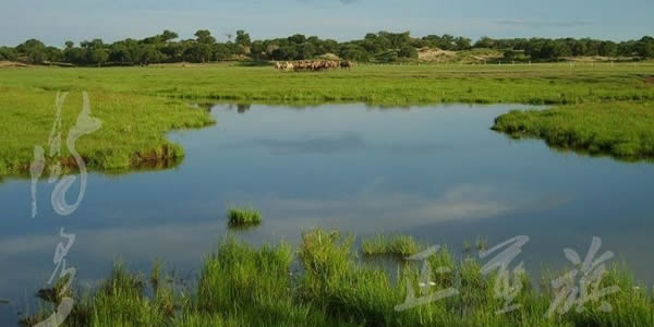 正藍(lán)旗植被類型豐富。擁有種子植物共計(jì)708種。北部渾善達(dá)克沙地東端發(fā)育有楊、樺次生林,西部低山丘陵的山體陰坡有島狀灌木林,北部是沙地榆樹疏林,中部有大面積的草原。夏季的正藍(lán)旗草原,藍(lán)天、白云、百靈鳥與星羅棋布的湖泊,蜿蜒曲折的河流和一望無際的山巒、樹叢、草甸交相輝映,構(gòu)成一幅和諧、優(yōu)美的草原圖景。