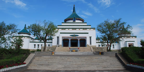 成吉思汗廟坐落在興安盟烏蘭浩特市罕山之巔,始建成于1940年,這座融漢、蒙、藏三個(gè)民族建筑風(fēng)格于一體的廟宇,從正面看是"山"字形。正殿當(dāng)中有16根粗大的紅漆明柱,四周繪有反映成吉思汗業(yè)績(jī)的精美圖案,中央為2.8米高的成吉思汗銅像;兩偏殿陳列有元代的兵器,服裝,瓷器等復(fù)制品,山門到正殿有寬10米、長(zhǎng)158米用花崗巖砌成的81級(jí)臺(tái)階。成吉思汗廟融蒙、漢 、藏三個(gè)民族的建筑風(fēng)格于一體, 采取古代漢族建筑中慣用的中軸對(duì)稱布局手法,建筑主體圓頂方身,綠帽白墻,具有典型的蒙、藏建筑特色。